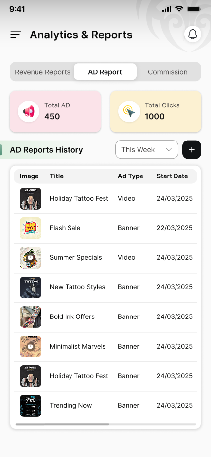 InkLink gives studios built-in growth tools to attract the right clients at the right time. Run in-app promotions, launch targeted ads, and send push notifications to nearby customers or your followers. You can also boost visibility through recommended shop placements and top-position exposure in the app - so your studio gets discovered faster and books more consistently.