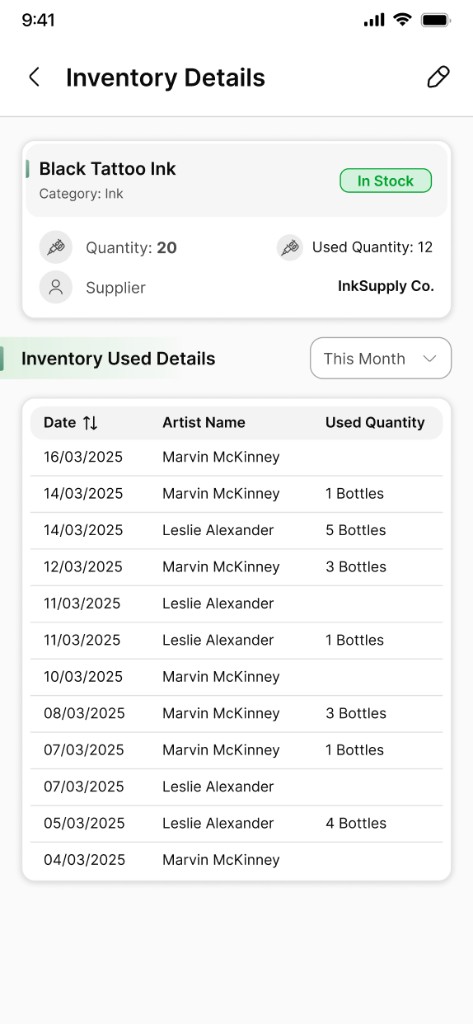 InkLink includes a dedicated inventory system built for tattoo studios. After each session, artists are prompted to log what they used - including ink, needles, cartridges, gloves, and more. Usage is stored automatically, so you can track stock levels, restock on time, and follow supply costs down to each artist and session.