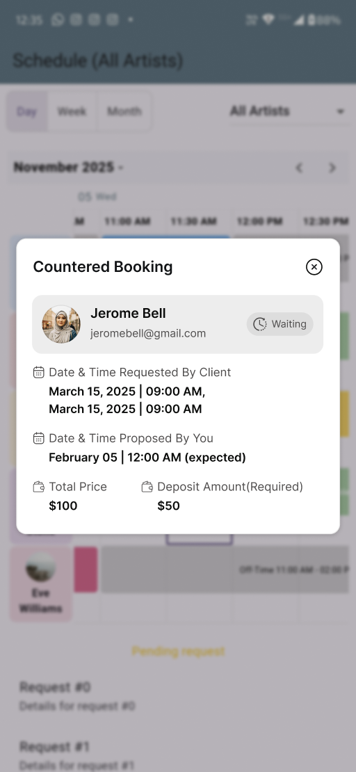 Handle every request, deposit, and confirmation in seconds.Drag and drop new requests into your calendar, send counter-offers, and let customers pay deposits instantly.
